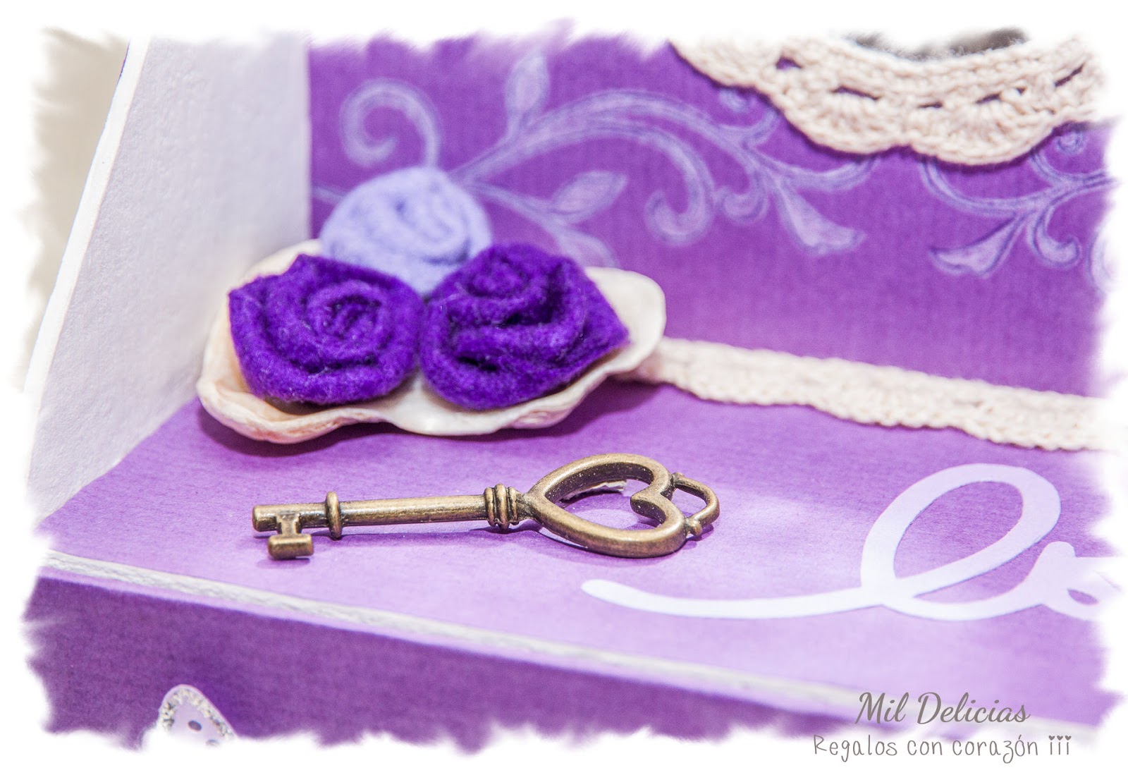 Las rosas son de fieltro y van apoyadas sobre una de las muchas conchas que mis hijos recogen con su padre durante las vacaciones en la playa.
